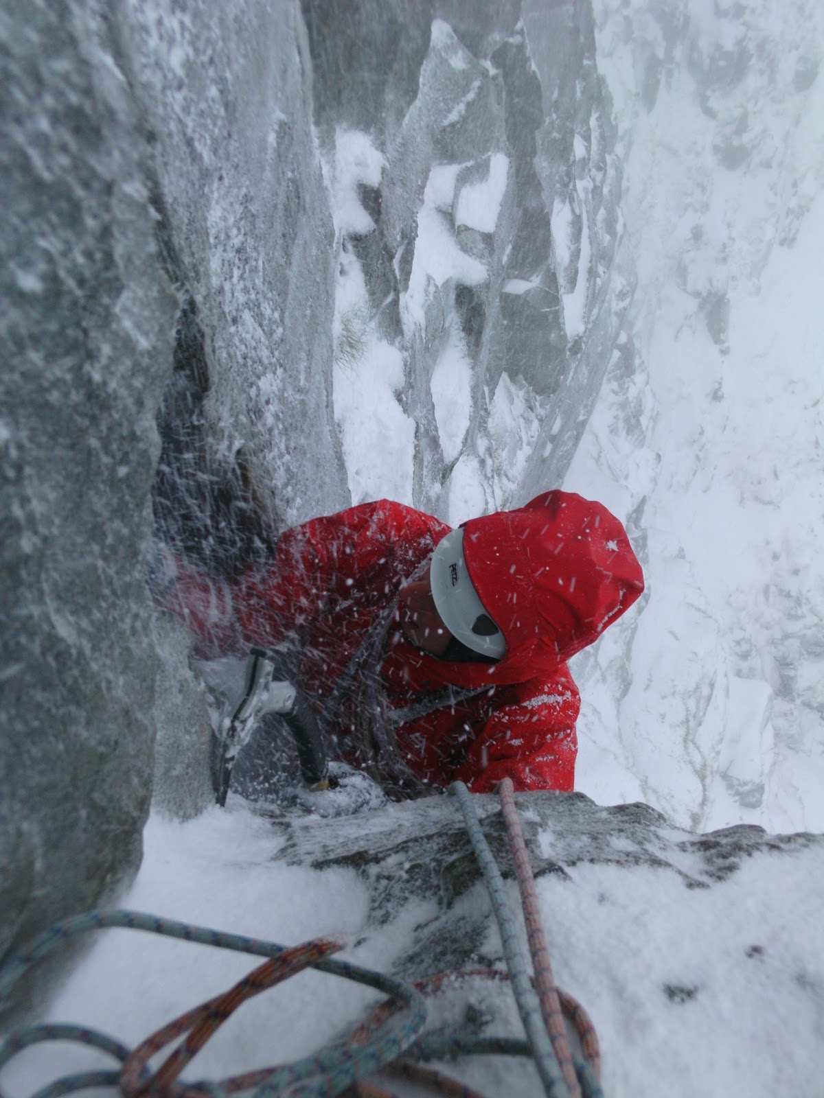 Mark goes for the move across the wall avoiding the footless corner, lots of snow was getting channelled down this section of the route from the groove above.